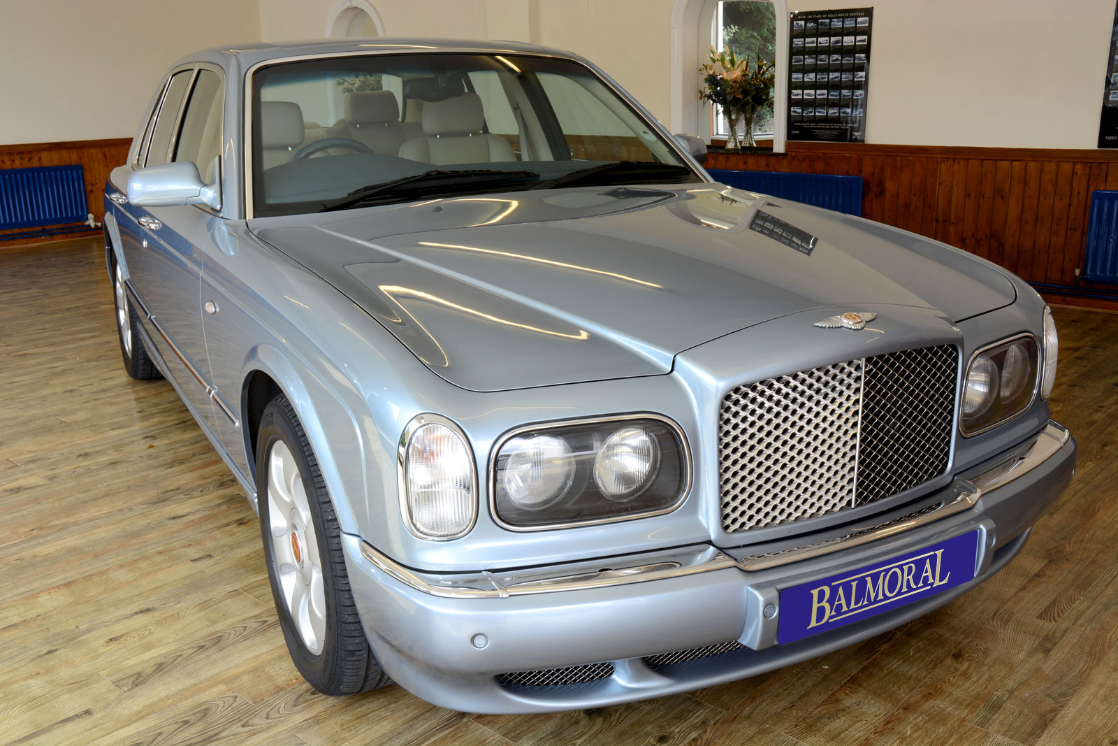 Finished in Fountain Blue with Cotswold Hide, French Navy Top Roll, Cotswold Knee Roll, Dark Blue Wilton Carpets, Satellite Navigation, Parking Sensors, Traction Control, Two Bentley Umbrellas, Full Service History.